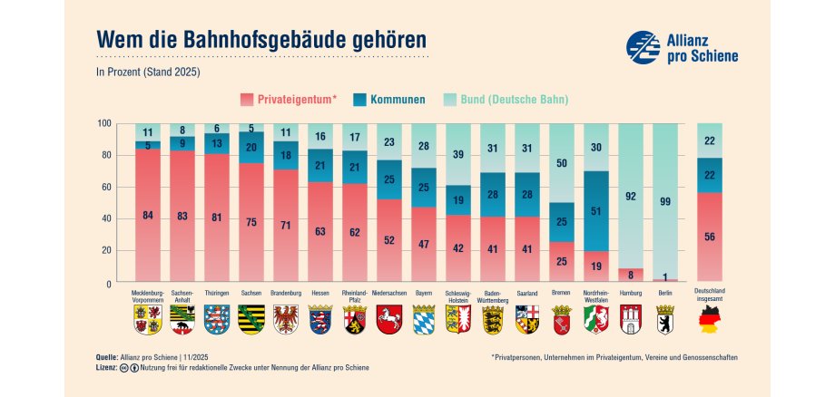 Die Allianz pro Schiene und der Deutsche Städte- und Gemeindebund (DStGB) fordern, bei der Entwicklung von Bahnhöfen auch das Bahnhofsumfeld stärker zu berücksichtigen. Für eine ganzheitliche Betrachtung sei es entscheidend, dass Förderprogramme des Bundes und der Länder auch für Bahnhöfe in der Fläche entsprechend ausgeweitet und ergänzt würden. Aktuelle Zahlen zeigen, dass fast 80 Prozent der Bahnhofsgebäude in Deutschland Kommunen oder Privateigentümern gehören. Daher müssten Fördermittel auch für solche Bahnhöfe und Bahnhofsgebäude zur Verfügung gestellt werden, die nicht mehr im Besitz der Deutschen Bahn sind.