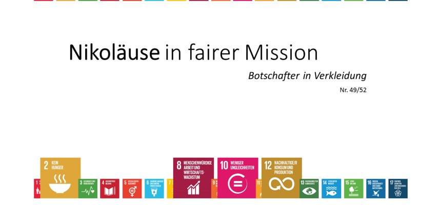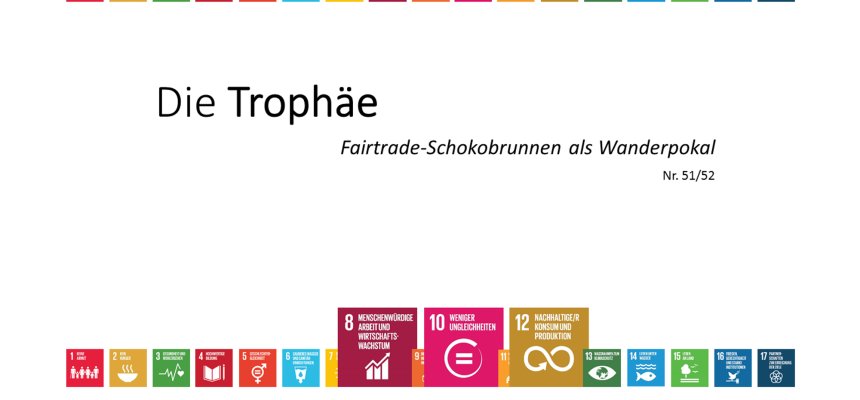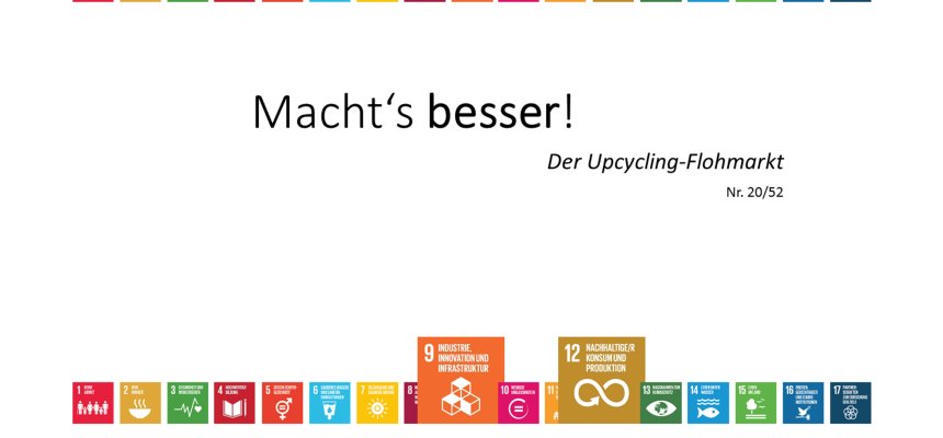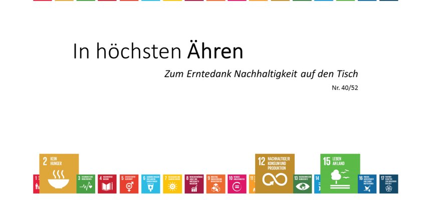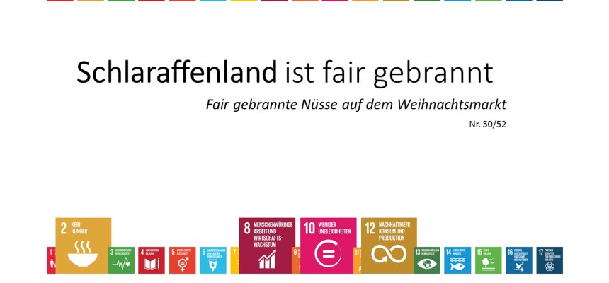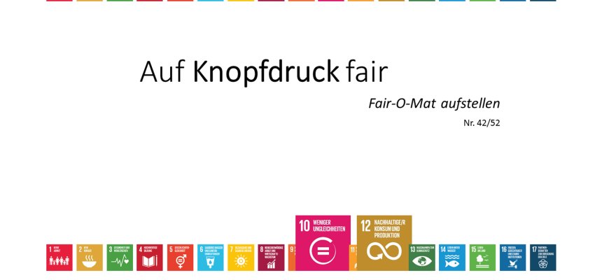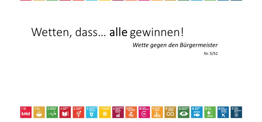 Der Kommunalsaisonkalender: Eine Ideensammlung von 52 Aktionen zu Nachhaltigkeit, fairem Handel und Umweltschutz für 52 Wochen des Jahres. Er lädt Kommunen und kommunale Akteure zum Stöbern ein und will Inspiration für einfache aber zukunftsweisende Aktionen geben. Dabei bezieht sich jede Aktion auf eines oder mehrere der Nachhaltigkeitsziele der Vereinten Nationen (SDGs). So zeigt der Kalender auch, wie einfach es sein kann, die Nachhaltigkeitsziele der Vereinten Nationen in die Tat umzusetzen.
